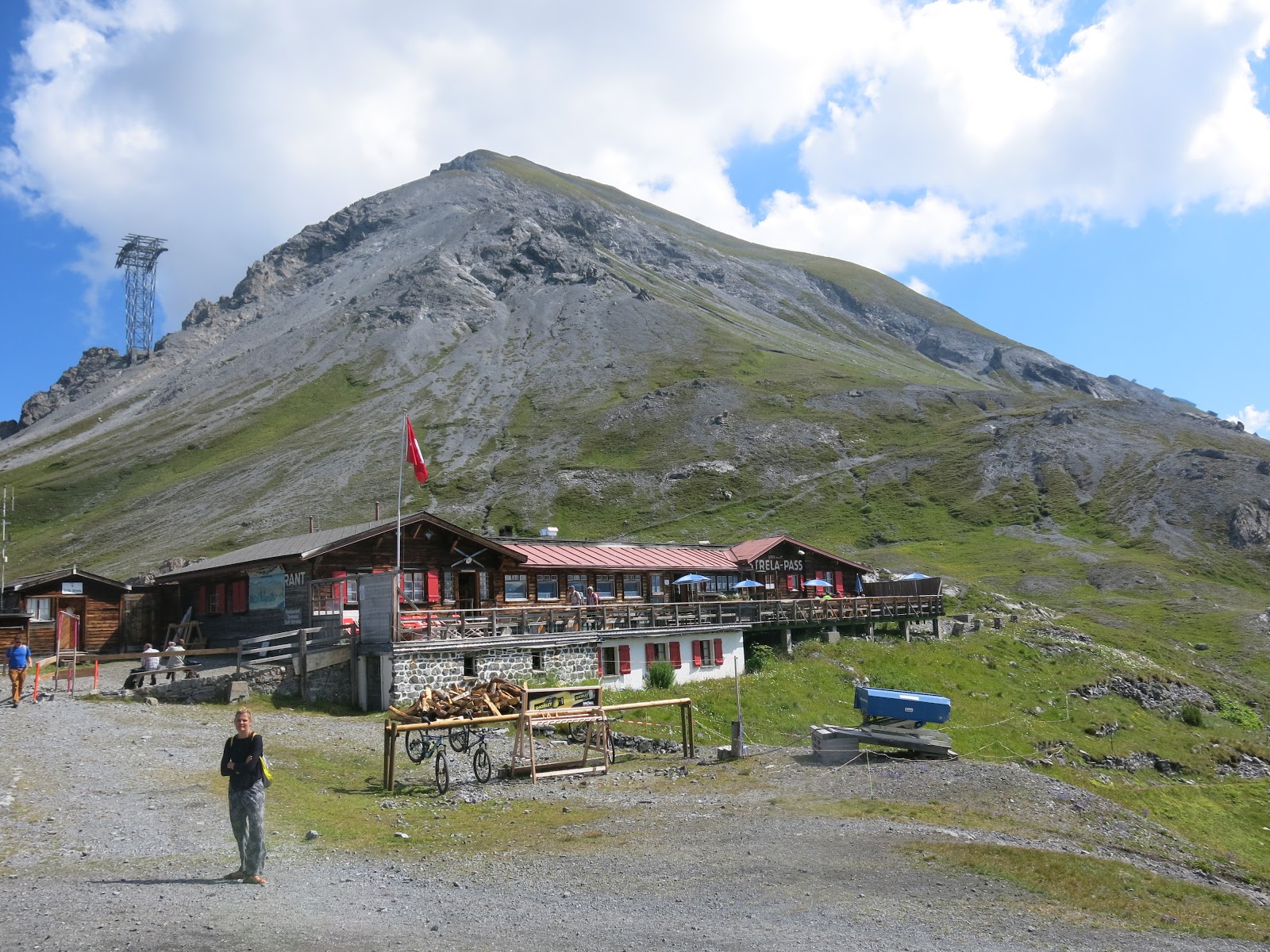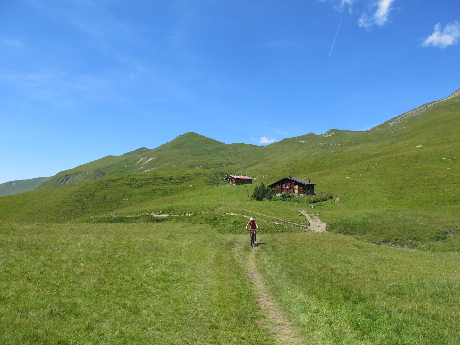 Rode the Parsenn Funicular again, and made our way down to Strela Pass, 2346 meters. Here we went right and dropped off into a new valley. The trail was quite steep, and Kevin thanked Francine for picking a ride with such a technical descent. She ended up walking a big chunk of the initial steep, loose, switchback terrain.