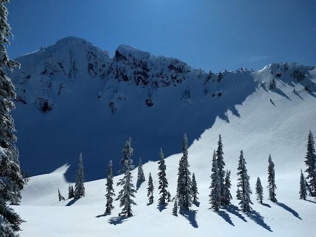 After skiing Lower International, we toured up the cat track to the top of the Armstrong Express and toured up the ridge looker's left from the unload station. Normally out of bounds, with no ropes or patrol we had virgin territory to explore. After a short climb we dropped the short pitch back to the front side and headed for the cars. What a great day to get outside.