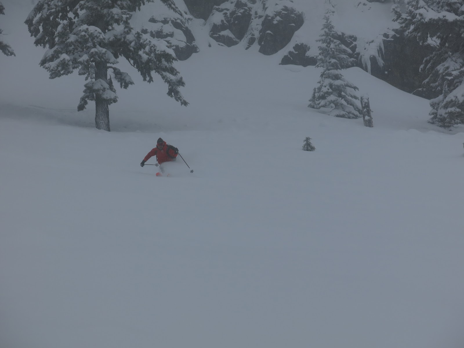 We opted for the International side for our descent and got first tracks. Probably one of the best descents down International that I have had. Absolutely no tracks, no people, no rope lines. Just Greg and I and a foot of powder that chased after you as you pointed your skis down the fall line.